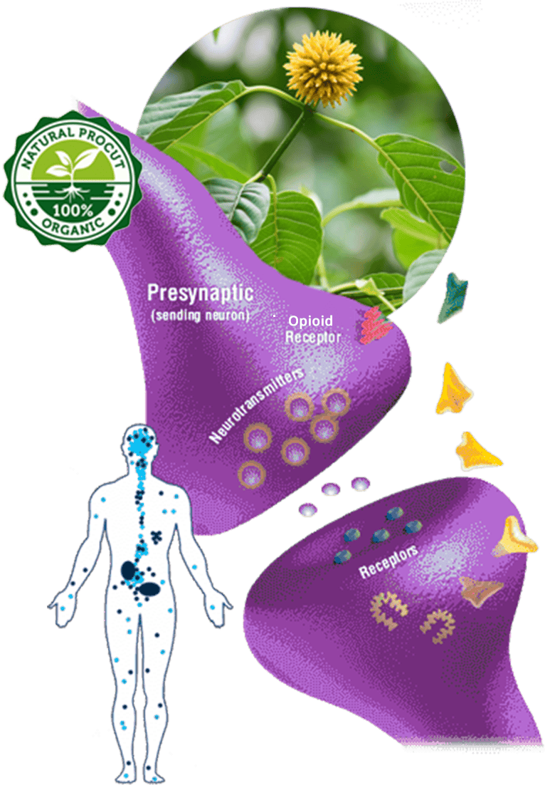 Kratom contains two powerful compounds; mitragynine and 7-hydroxymitragynine. Mitragynine interacts with your body the same way pain management drugs do, while 7-hydroxymitragynine blocks your body from perceiving pain. When mitragynine and 7-hydroxymitragynine bind to pain receptors located in the central nervous system and elsewhere within the body, pain relief is experienced almost immediately.